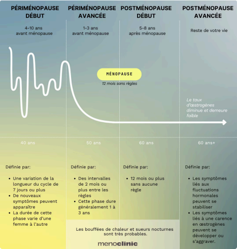 Explorez les différentes étapes, de la périménopause précoce à la post ménopause avancée, pour mieux anticiper.